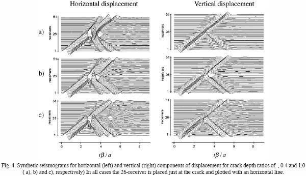 In Figure 4, horizontal (left) and vertical (right) displacements represented as synthetic seismograms for crack depth ratios of d/a=0.1, 0.4 and 1.0 (upper, middle and lower, respectively) have been plotted for this one vertical crack model (in all cases, the 26threceiver is placed just at the crack and plotted with an horizontal line). In all cases wave amplifications can be observed for the nearest receiver placed at the left side of the crack, where the surface wave impacts. For the deepest crack model (d/a=1) the reflected and transmitted waves for the two components of displacement are clearly defined. However, when the crack becomes shallower, the diffracted wave field for horizontal component shows more complicated patterns for the receivers behind the crack. In the case of vertical components, when the crack depth ratio is d/a=0.1 , the transmitted amplitude of the wave is almost equal to those of the incident wave and the wave amplification at the crack is almost negligible. For the other cases, d/a=0.4 and d/a=1.0, the amplitude of transmitted waves are reduced while those of reflected ones increases.