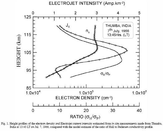 Fig. 1 shows the height profiles of the ratio σH/σP (that is a measure of the vertical Hall polarization field as seen from equation (2) estimated from MSISE90 atmospheric model and the ambient electron density measured using rocketborne experiment (also given in the fig.) conducted from the equatorial station Thumba, India (Subbaraya et al, 1972; Muralikrishna, 1975). Also given in the fig. is the electrojet current intensity estimated from in situ observation. Fig. 1 represents the electrojet currents under normal conditions, when there is no effect of neutral or charged dust particles.