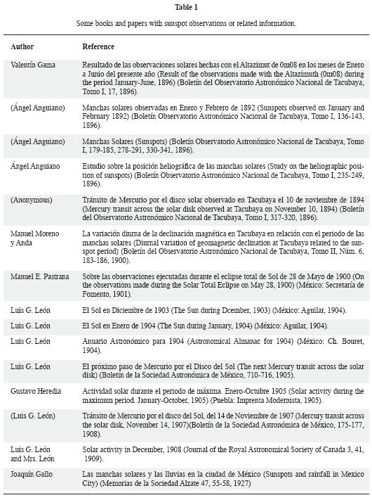 During the first years of the 20th century, two Mexicans continued the tradition of studying solar activity: Professor Luis G. León, founder of the Astronomical Society of Mexico (1902), who published several papers on sunspots (Table 1), and the Jesuit Gustavo Heredia, who observed the Sun from Puebla Observatory (Fig. 1). Some books and papers on sunspot published in Mexico at the end of 19th century and early 20th century are summarized in Table 1.
