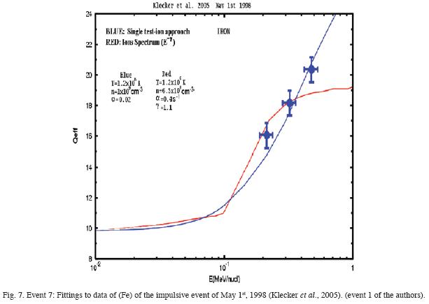 The best fits are obtained with both, the onefree parameter (α) approach (a), and approach (b) in the option (ii), as is illustrated in events 1, 2, 4, 13, 14, 15, 16. 17. Relatively good fittings are obtained with approach (b) in option (i), though results deviate from data in events 9 and 11 at low and high energies respectively. The worst fit is systematically obtained with approach (b) in the option (iii) as can be seen in events 1, 2, 4, 13, 14, 15, 16. 17. We have failed, however, to fit events 10 and 12, where even under extreme values of the parameters, low energy and high energy data cannot be fitted simultaneously, so, we have arbitrarily chosen to fit the high energy data; if low energy data in these two events would correspond to still lower energies, by a factor of ~ 103 times, we could fit data quite correctly, as was shown in Fig. 2 of RodríguezFrias et al. (2000). Besides, we cannot attribute our fail with these events to the gradual behavior of them, because most of the events that have been correctly fitted in this work, have been also classed as of gradual nature, as is the case of events 8, 9 and 11, 1317. Nevertheless, it should be emphasized, as pointed out by Popecki (2006), that the distinction of SEP into two classes as distinguished by charge state values is not a strict categorization as comes out from observations (Oetliker et al., 1997). Perhaps the involved acceleration process in these cases is not of the stochastic Fermitype nature, or, the involved energy spectra were not of the kind used in this work. A more refined analysis is needed in these cases.