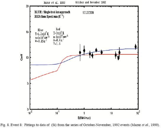 It is worth noting here, that such oversimplification was pointed out long ago as a natural implication of the criteria for the establishment of charge interchange developed in PérezPeraza et al.(1983, 1985): as mentioned before it was found that depending on several factors during ion acceleration, charge equilibrium could be established, while in other circunstances electron capture can be inhibited, so that ions acquire faster a high mean charge than it is expected from charge equilibrium, or a lower mean charge at a given energy when the conditions during acceleration are such that electron loss is inhibited; additionally, under some conditions charge interchange does not occur at all, and ions keep their local charge q0(T) from the corona