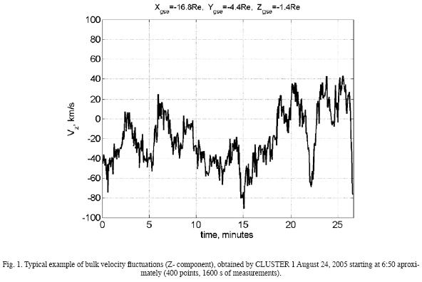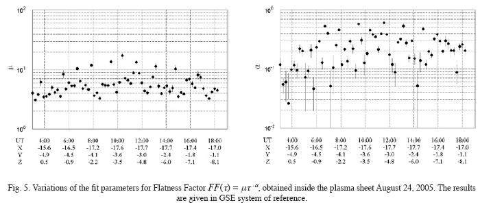 Fig. 5 shows variations of the fit parameters for Flatness Factor for Vz component of the bulk velocity across the plasma sheet, obtained August 24, 2005, using the CLUSTER 1 data (end of the main phase). As it can be seen, the level of intermittency increases in the central part of plasma sheet (according to the magnetic field data, CLUSTER 1 crossed the neutral sheet in 10 UT, approximately, not shown). Results, obtained for other two components of the bulk velocity were similar.