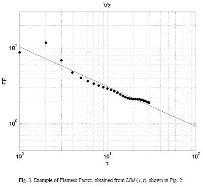After that we calculated the flatness factor using the equation (3) (see Fig. 3) and fitted them by a power law FF(τ) = µτα. As can be seen from Figs. 2 and 3, the values of flatness factor generally exceed 3, and the bulk velocity series analysed show an intermittent behaviour.