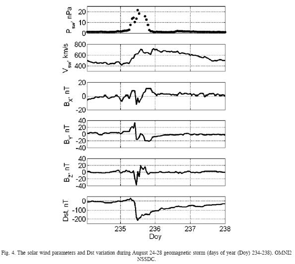 Fig. 4 shows the solar wind parameters and Dst value for the August 2428, 2005 geomagnetic storm (minimum Dst=216 nT (provisional)). The satellite crossed the plasma sheet three days before the storm analysed August 21, 2005 between 1323 UT, when the values of Dst were nearly 0. The first plasma sheet crossing during the storm occurred August, 24 between 418 UT during the main phase and beginning of recovery phase. The second crossing occurred August 26 between 620 UT at the end of recovery phase. Analysis of provisional auroral electrojet indices showed that the substorm activity was low (AL>200 nT) during August 21, very high during August 24 (AL=2500 nT, at 11 UT, approximately), and ceased gradually during August 25 and 26, and stopped August 26 at 9 UT.