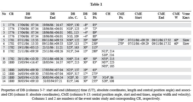 We chose 14 DBd events, listed in Table 1, produced during the last two solar minima. In order to point out the fundamental characteristic parameters of the DB process, we examine the evolution of each prominences/filaments mainly based on Hα patrol filtrograms and/or spectroheliograms of the ParisMeudon Observatory (PMO) solar archive. We selected nine wellisolated DBs for the first studied minimum of solar cycle 21 (19851986) and five DBs for the second solar minimum, that of solar cycle 22 (19941995). Each event (or group of events) as a single solar chromospheric activity, has a unique geoeffective consequence. For each event, or group of events, we analyze adjacent CHs evolutions and CMEs detected if any. In order to check the detailed evolution of DBs and CHs turning out at the backside of the Sun, we analyze the CR optic and magnetic synoptic maps with respect to DBs occurrence, as well as the preceding and following one.