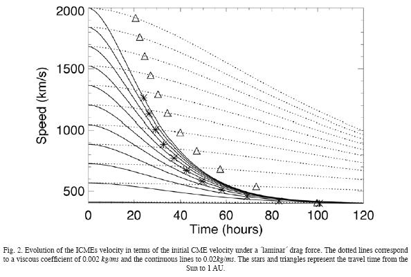Upon inspection of the solutions given by equations 6 and 7 and comparing with experimental observations of the phenomena (Gopalswamy et al., 2000) we have identified extreme values for the viscosity and drag coefficient, η and Cd respectively. Such comparison was meant to recover the fast CMEs velocities near the proximity of the Sun (around 400 to almost 3000 km/s. Whereas near the Earth (i.e. at a distance of 1AU), the ICMEs velocities diminishes down to a range of 400 to 1000 km/s). The corresponding values for the viscosity and drag coefficient where η1 = 0.002 kg/ms and Cd1 = 200 for the minimum case; and η2 = 0.02 kg/ms and Cd2 = 2000 for the maximum drag effect. To analyze the motion described by our solutions (equation 6 and equation 7) we have plotted the resulting velocity versus time, for the two extreme cases mencioned abobe. Our results are plotted in Fig. 2 and Fig. 3, for 'laminar' and 'turbulent' ICMESW interactions, respectively. Continuous lines in Fig. 2 represent the ICME dynamics in the 'laminar' regime using η2 and dotted lines represent the same behavior but with η1. At t = 0 the velocity is the initial CME velocity. The stars and triangles are the ICME arrival time at 1 AU, with η2 and η1 respectively. In Fig. 3 the continuous lines are the solutions of equation 7 under a drag coefficient of Cd2 whereas the dotted lines are the solutions with Cd1.