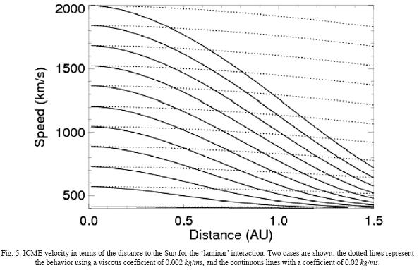 Independently of the values of the coefficients (drag or viscous), it is easy to see that in all cases, the ICME has a damp (more accentuated when the coefficients have higher values) this fact supports the idea of a kind of viscous interaction between the ICME and the interplanetary solar wind. This interaction produces the deceleration of the structure to an asymptotic value of 400 km/s, which corresponds to the ambient solar wind velocity.