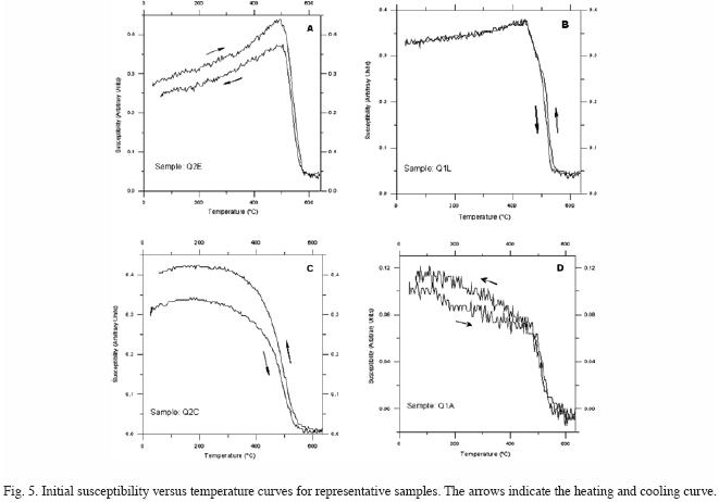 Continuous lowfield susceptibility vs. hightemperature curves performed in air show the presence of Tipoor titanomagnetite as dominant magnetic mineral (Fig. 5). Only exception is sample Q1L which shows two ferrimagnetic phases with Curie temperatures compatible to both Tipoor and Tirich titanomagnetites. Some samples show low initial susceptibility signal, which indicates poor magnetic mineral presence (sample Q1A, Fig. 5). For archeointensity determination we selected samples that show almost reversible kT curves.