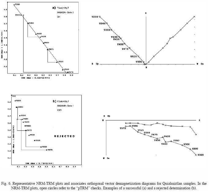Since an archeointensity master curve for Mesoamerica is yet of preliminary nature (e.g., Gonzalez et al., 1997; UrrutiaFucugauchi, 1996), we used global data curves (McElhinny and Senanayake, 1982; Yang et al., 2000; Bowles et al., 2002; Genevey and Gallet, 2003) reduced to eastern Mexico (19° 40' 11.4" N, 96° 24' 54.9" O) as an alternative way of dating. We carried out in this study several magnetic experiments (susceptibility vs. temperature curves, alternating field and thermal demagnetization, hysteresis cycles and archeointensity) on fragments of PreColumbian pottery from the Quiahuiztlan archeological site (Veracruz State, Mexico).