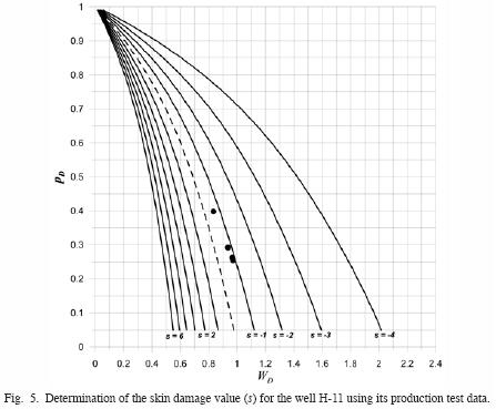 4. The dimensionless inflow curve of the well is overlapped on the geothermal typecurve with damage effects shown in Fig. 1. The skin damage effect (s) corresponding to the best overlap of both curves, gives the required skin damage effect value.