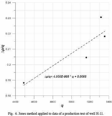 In order to verify this determination the qualitative method of Jones et al. (1976) is used to confirm the presence or absence of the damage determined with the proposed methodology. Fig. 6 shows the plot of q versus Δp/q in the form suggested by the Jones method. It can be seen that the ordinate value is less than 0.05 (b = 0.0068); therefore it is verified that there is not damage in the well. Furthermore, the value of the skin damage effect also is verified with that obtained from transient pressure tests of s = 1 (Table 2).