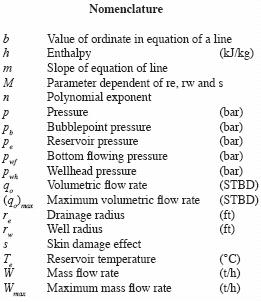 where W is the produced mass flow, Wmax is the maximum mass flow (theoretically for pwf = 0). The flowing bottom pressure is pwf and the reservoir pressure is pe.