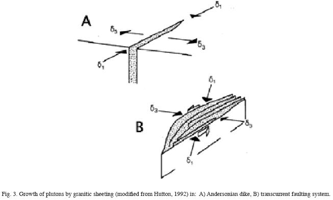 Recent studies of the emplacement of granitic plutons suggest a close relationship between regional faults and pluton location. Structural as well as petrological studies both show that some granitic plutons are emplaced in tectonic 'holes', pull aparts or extensional zones within regional strikeslip fault systems (Fig. 2) (Cambray et al., 1995; Vegas et al., 2001). The plutons grow by granitic sheeting the incremental addition of magma by extension at releasing areas, and subsequent storage (Figs. 3, 4) (Hutton, 1992; Hutton and Reavy, 1992). Recent highprecision plutonic dating supports the idea of growth of plutons by sheeting (Coleman et al., 2004). In their study of the Tuolomne Intrusive Suite, perhaps the bestknown of all Sierran rocks, Coleman et al. found diachronous dates within the suite and within individual plutons, from younger in the core to older in the outer zones. If plutons develop in a local extensional tectonic environment, then it is natural to assume that the volcanoes above them will also form in relation to the tectonic environment. The relationship will not be exactly the same, since a volcano represents the response of the crust above the level of the pluton. We can investigate the Long ValleyMonoInyo Craters volcanic field to try to understand the relationships.
