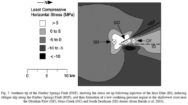 The indication is that the Inyo Dike, found by drilling underneath the main Inyo vents, neared the Hartley Springs Fault as it propagated southward from the Mono Basin ~1350 A.D. Once the lateral distance between dike and fault was sufficiently small, the mechanical interaction between them is thought to have triggered the slip observed on the fault. The slip, in turn, reduced the horizontal confining pressure in a region near the southern tip of the fault. The presence of the main Inyo vents in this region suggests that the reduction in confining stress was sufficient to allow magma to propagate to the surface and erupt, in a type of "fault pumping" mechanism (Fig. 7) (Bursik et al., 2003). The resulting volcanotectonic 'cascade' of eruptions and earthquakes thus activated a large section of the range front stress relief system because of the positive feedback provided by each element to continued activity. In the kinematic interpretation of fault and dike relationships between the Mono and Inyo chains and the range front fault system, Bursik and Sieh (1989) hypothesized that either dikes or faults accommodated regional extension at any one position along the Sierran range front. The dynamic analysis of dike propagation suggests that the relationship between the two mechanisms is somewhat more complicated, and that the two mechanisms for accommodation of crustal stretching might interact locally. One recently documented example of this in the continental arc environment comes from Karimskiy volcano, Kamchatka (Walter, 2007). There too, a lowconfining pressure area at a fault tip was dynamically created in which magma rose to the surface and erupted.
