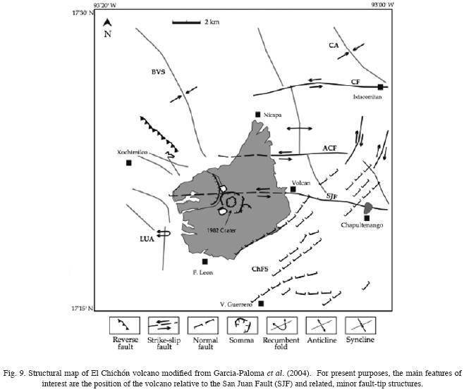 Within this larger setting, El Chichón has been found to be situated at the tip of the San Juan Fault within the Strikeslip Fault Province, on the releasing side of the fault tip (Fig. 9), perhaps even in a small, active pullapart basin (GarcíaPalomo et al., 2004). Volcanism has been focussed at this spot for at least ~ 280ka (Tilling et al., 1984), making it a site of quite longlived volcanic activity. Thus, although the tectonic province is overall transpressional, magma is able to be erupted at the surface given a local extensional setting, not only at El Chichón, but elsewhere within the arc. The setting is in fact analogous to that of the Inyo Craters. The analysis of the regional tectonic setting by GarcíaPalomo et al. (2004) thus suggests that not only on the dynamic event scale related to fault pumping (as at Inyo Craters and Karimskiy) but also at the longterm kinematic scale a localized site of tension is a favorable setting for volcanic eruption. It may be significant that this particular setting for the surface expression of magmatism is common to both compressional and tensional regional tectonics.