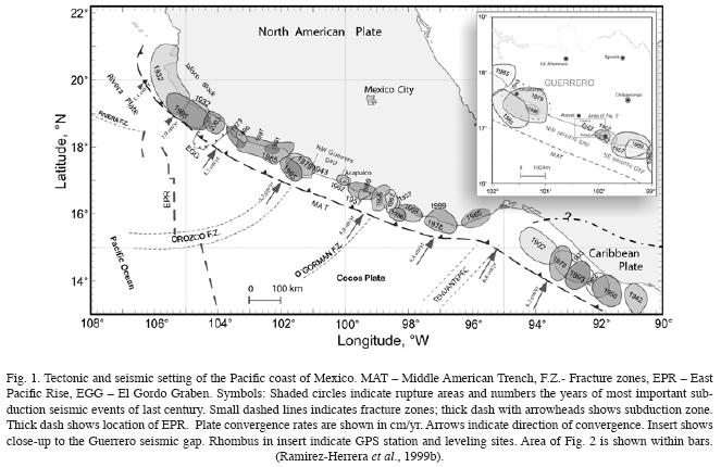 Plate convergence rates vary from 5.3 cm/yr to 5.8 cm/yr (Fig. 1). The Northwest Guerrero seismic gap has experienced large historical earthquakes, notably in 1911 (Ms 7.8). However, no large magnitude events and only a few Ms