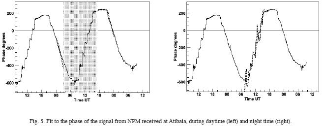 Using LWPC we have attempted to fit the data with the waveguide cavity as defined in this section. Although some discrepancy is present, as a first result the fit is satisfactory as concerns the amplitude (Fig. 4). However there is room for improvement and a better fit will probably require a more detailed ionosphere model. As far as the phases are concerned, we are able to fit the data under day time and nighttime conditions as shown in Fig. 5, left and right panels respectively.