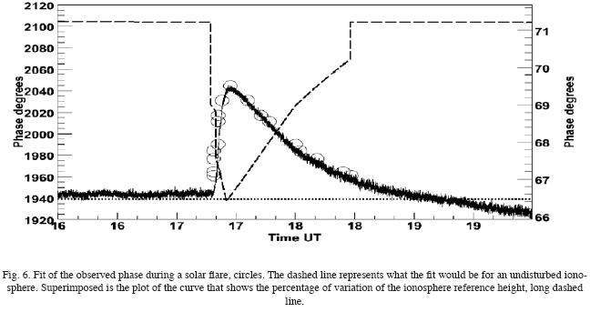 Transient signatures of solar flares, occurring when the low ionosphere is ionized because of the sudden entry of solar Xray photons can be identified and modelled. Typically a rapid phase advance is observed, which progressively decreases until it reaches its nominal value for an unperturbed ionosphere. This behaviour can be modelled assuming that the Dregion conductivity changes as to lower its reference height, followed by a less rapid reestablishment of its unperturbed configuration as the flare vanishes. In Fig. 6 it is plotted the data along with the fit for a solar flare observed at Piura, Peru. Clearly the fitted points (circles) reproduce the data very satisfactorily. The parameter H is shown as a percentage relative to a reference height; its variation inversely follows that of the flare as expected. The parameter β was held constant.