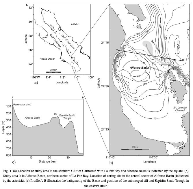 Alfonso Basin isa margin closed depres sion (maximum depth 420 m) located inside the Bay of La Paz, at the southwestern sector of the Gulf of California (Fig. 1). Its location at southern Gulf of California in the transition area between the Gulf and the open Pacific Ocean makes the Bay a sensitive recorder of regional variations in the Gulf and the larger scale climatic and oceanographic circulation of the subtropical Pacific Ocean (MonrealGómez et al.,2001).