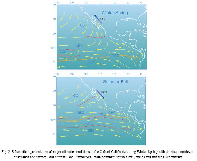 The Bay of La Paz exchanges mixedlayer waters with the Gulf of California predominantly through Boca Grande, at the northeastern part of the Bay. Equatorial Surface Water (ESW) flows from the Gulf into the Bay and once there due to evaporation processes, this water increases its salinity above 35.00 transforming to Gulf of California Water Mass (GCW) (MonrealGómez, et al., 2001). The isolation of the bottom of the Bay by a bathymetric sill (275 m depth) (Fig. 1c) induces low oxygen content conditions, particularly in the Bay bottomwaters (O2< 0.1 ml/l).