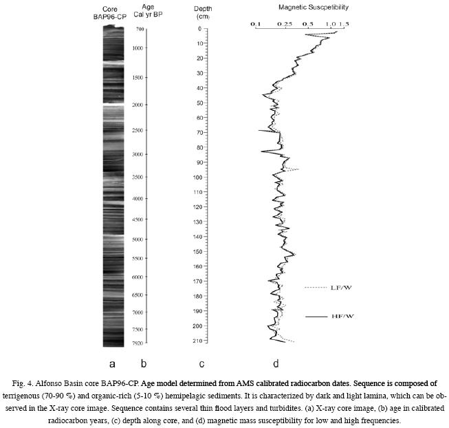 Our samples come from the Kasten core BAP96CP (24°38.12' N, 110°33.24' W) recovered from the central sector of Alfonso Basin in the Bay of La Paz (at 390 m depth). Survey and drilling/coring information, core description and details of microfossil analyses have been reported in PérezCruz (2006). The core was Xray examined and described and shown to be characterized by a finely laminated sequence (Fig. 4). Radiocarbon dating was carried out on benthic foraminifer's shells (Bolivina subadvena), with three intervals providing accelerator mass spectrometry AMS dates: 210211 cm, 7500±50, 101102 cm, 3830±35 and 1920 cm 1730±45 14C yr B.P (PérezCruz, 2006). To construct an age model, dateswere were converted to calibrated years B.P. using program CALIB 5.0 (Stuiver et al., 2005). Quoted dates are expressed in radiocarbon calibrated years (cal. yr B.P.). Average sedimentation rates range from 0.34 mm/yr near the top of the core to 0.26 mm/yr below 100 cm, with whole core average sedimentation rate about 0.30±0.04 mm/yr.
