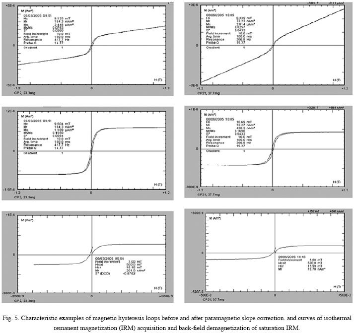 Hysteresis loops are dominated by paramagnetic components, whose relative contribution varies through the sequence. After slope correction, well defined hysteresis loops showing low coercivity spectra are determined (Fig. 5). Backfield demagnetization of saturation IRM was also measured in all samples (Fig. 5). Hysteresis parameters are calculated after correction for the paramagnetic contribution (S*). Domain states are estimated from the ratio plot of hysteresis parameters (Day et al., 1977; Dunlop, 2002).