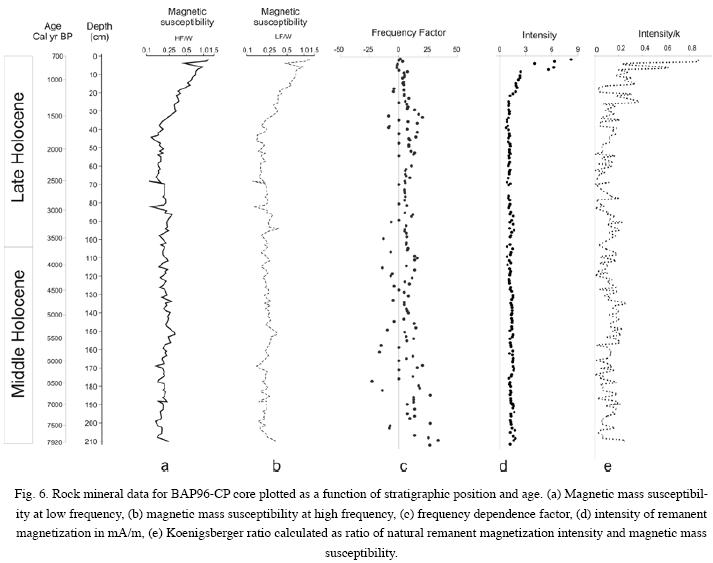 The magnetic susceptibility logs are characterized by higher frequency dependence factors (Fig. 6c), which suggest contribution of very finegrained SP particles particularly for the Middle Holocene (>3,800 cal. yr BP). Relative contribution of SP particles is also supported by the distribution trends of hysteresis parameter ratios in the domain state plot. The pattern of frequency dependent susceptibility displays a marked change at about the Middle to Late Holocene transition, with high more variable values in the Middle Holocene than during the Late Holocene (Fig. 6). These changes are compatible with having warmer and drier periods in the Middle Holocene and increased precipitation and intensification of El Niño Southern Oscillation (ENSO) in the Late Holocene (e.g., Clement et al., 2000; Cole et al., 2002; PérezCruz, 2006; Miao et al., 2007).