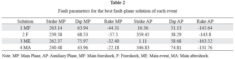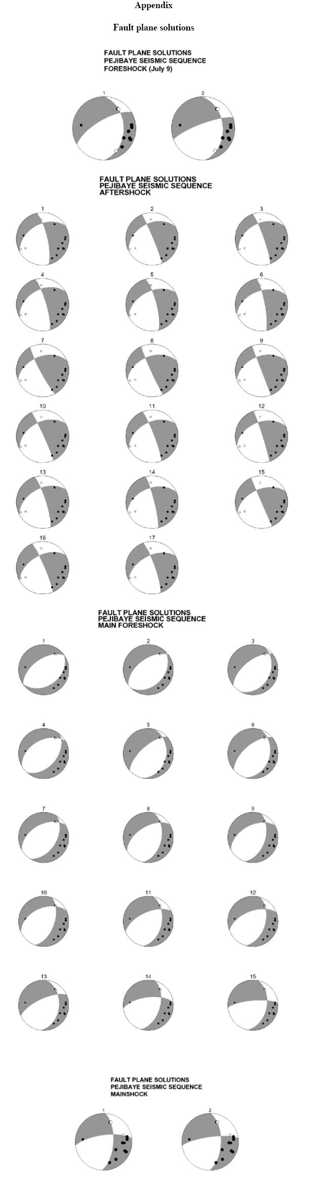Faultplane solutions have been determined for two foreshocks, for the main shock, and for the main aftershock of the Pejibaye seismic sequence (Fig. 4). The source parameters of all the 4 events are summarized in Table 2. For the main event, only two solutions were found, with a good estimation of the focal mechanism and the proper selection of the fault plane. In the case of the foreshock and the main aftershock, the inversion yielded a group of similar solutions. All the solutions are shown in the appendix.