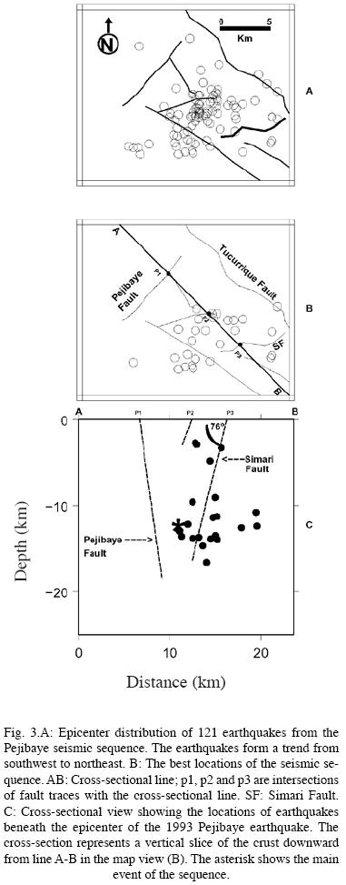 In a attempt to determine the source for the Pejibaye seismic sequence, 121 events were located with nearby seismic stations and a local velocity structure (Fig. 3A). The epicenters were concentrated in a rectangular area of 8 km x 5 km to the southeast of Pejibaye. The orientation of this area coincides with the strike of small northeast faults.