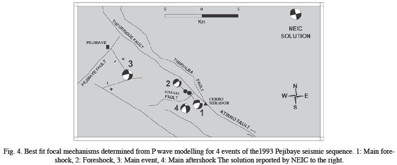 The focal mechanisms suggest that an oblique NE fault, dipping to the northwest generated the 1993 Pejibaye seismic sequence. That fault ruptured along a short length but never broke through to the surface. The maximum magnitude expected for a 10 km long normal fault is 6,5 (Ml) according to Matsuda (1977). Then, the 1993 Pejibaye earthquake was generated by a fault whose length is smaller than 10 km.