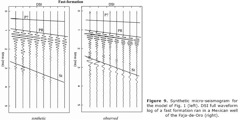Figure 9 shows the comparison between the synthetic microseismogram computed with the DWN model of the fluid filled well with a point source at the origin (Figure 1) and the full waveform responses from the DSI log in a fastformation. The data were selected from the suite of logs in a well at the FajadeOro Mexico. The input parameters used for computations are: Vp = 2,930 m/s, Vx = 1,437 m/s, Vf = 1,088 m/s, ρ= 2.37 g/cm3,ρf= 1.4 g/cm3 and r= 0.177 m. As reference, we can see from the available petrophysical report that the formation interval of interest is described as good consolidated homogeneous sandstone. The good quality of logs and the constant value of the caliper indicate this well section is a suitable candidate to be modeled. In both microseismograms of Figure 9, the amplitude displacements of eight vertical aligned receivers separated by Δz = .1524 m are plotted versus time. The sourcefirst receiver distance (offset) is 2.74 m = 9 ft.