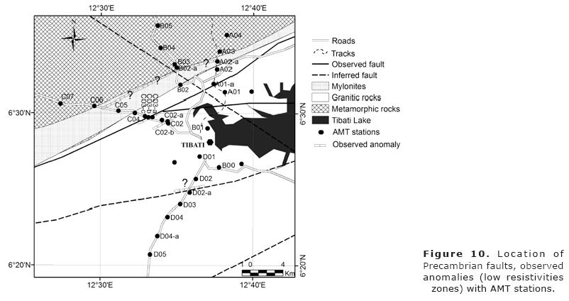 As we can see in Figure 10, there are several agreements between the geological positions and those revealed by the AMT study. In particular we can observe that the mylonitic zone seems more extended along the TibatiBanyo profile than along the others.