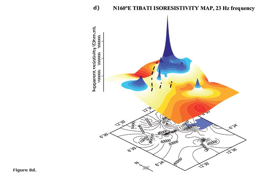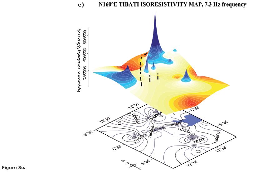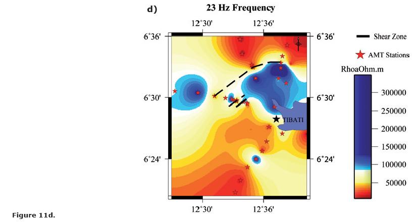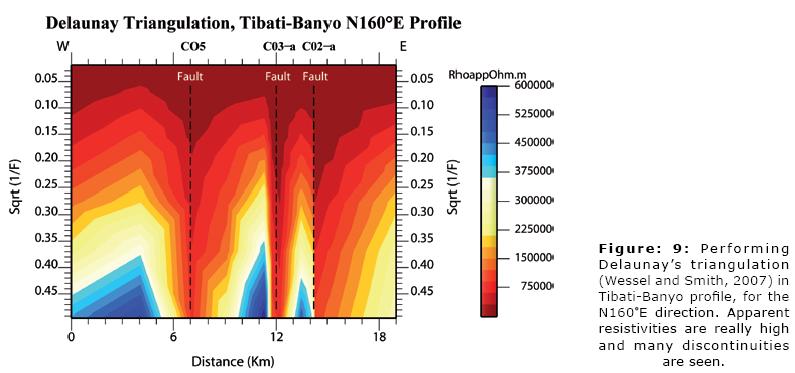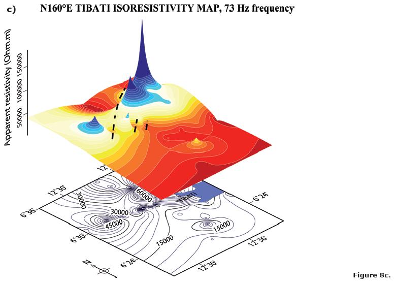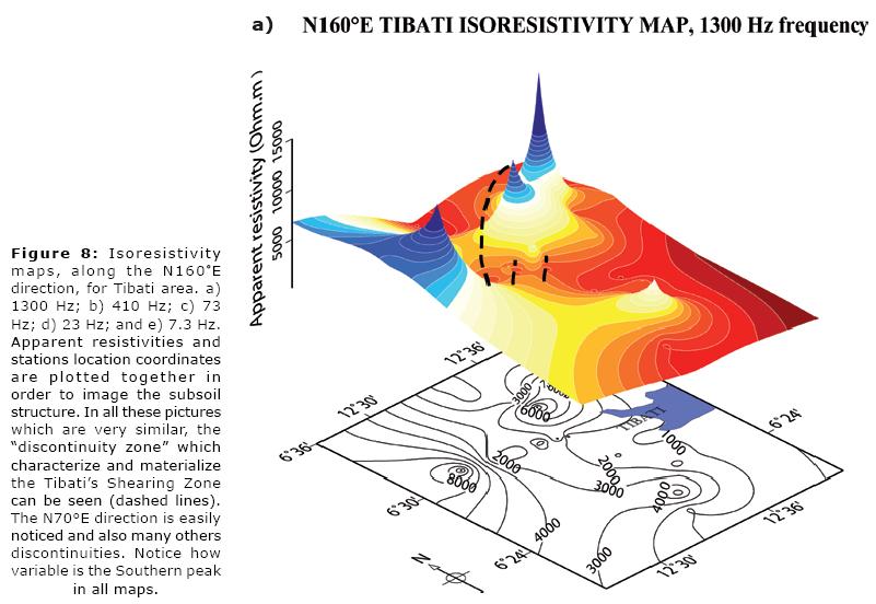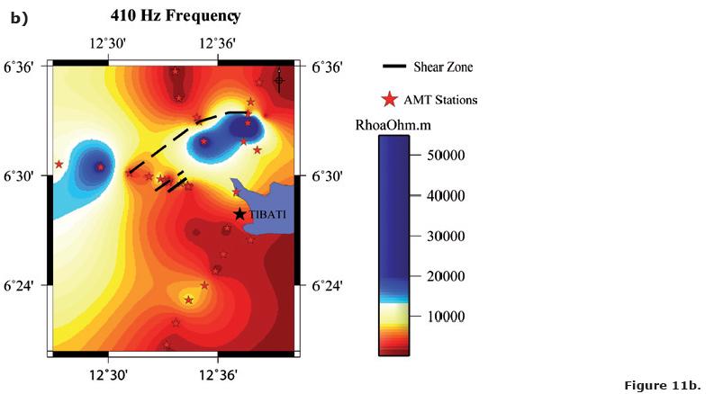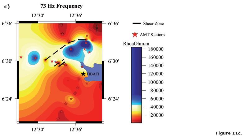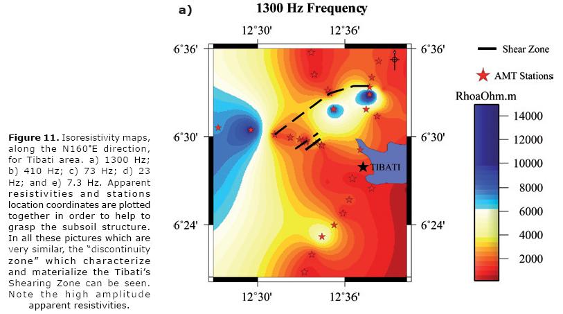 It can be noted that the whole frequency range that characterize our measurements is featured by the same pattern of resistivity variations, which can be observed in Figures 8a through 8e (8b, 8c, 8d) corresponding to the selected frequencies of 7.3, 23, 73, 410 and 1,300 Hz for the N160°E direction). Accordingly, we observe that a similar AMT signature (i.e., resistivity variations patterns) along the Tibati Shear Zone reaches deep crustal levels. The increase in density measurements along the profiles enabled the delimitation of discontinuities in the resistivity, in particular along the Banyo profile. These discontinuities in the resistivity are interpreted as due to major "shear zone". The discontinuity zone on the Banyo profile is more important than those on the Tignere or Djombi profiles (i.e., the mylonitic zone seems more extended along the TibatiBanyo profile than along the others). Figure 9 elaborated following Delauney's triangulation (Wessel and Smith, 2007) for the TibatiBanyo profile, and for the N160°E direction images the discontinuities in the resistivity distribution, and enhances its cortical nature.