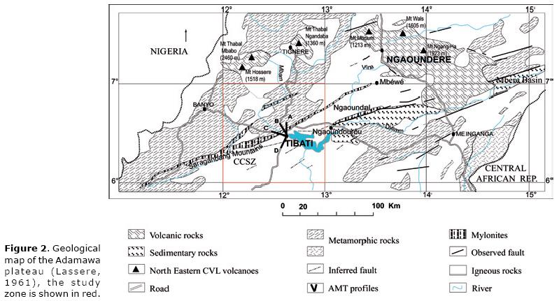 The structural directions are the directions which diagonalise Cagniard's tensor, characterized by two resistivities: the transverse and the longitudinal resistivities. These directions are obtained by various dataprocessing techniques of tensor analysis (Vozoff, 1972), by the rotation method for MT scalar resistivity data (ManguelleDicoum et al., 2000, 1992) or estimated based in geological information on the study zone. The MT method using electromagnetic signals has been widely applied to many fields of geophysical exploration, such as mineral exploration, geothermal exploration etc., this technique has been used for volcanological research (i.e., Utada et al., 1984) or research on fault structure. This paper, is the first of a series of papers focused on a segment of one of the major lineaments closely related to the CVL. Here, this geophysical technique is used to contribute with structural information about the FoumbanAdamawa shear zone, that passes very close to Tibati.