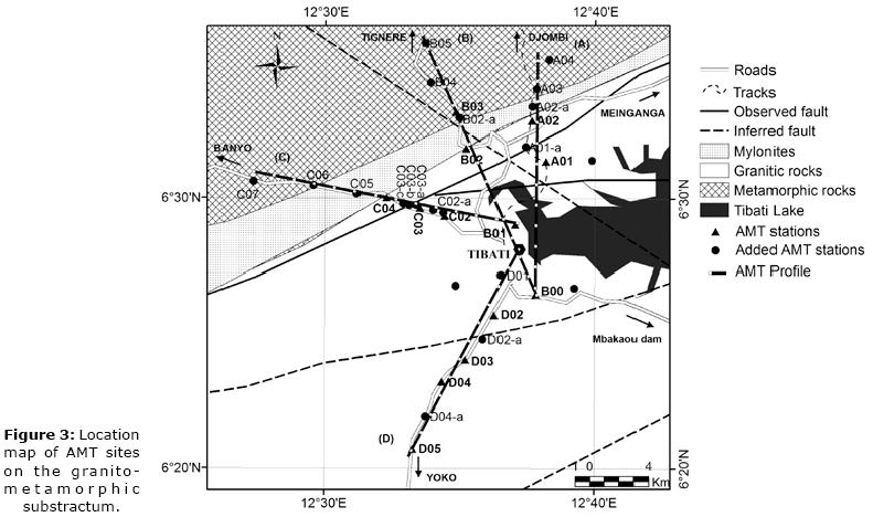 Nevertheless, the analysis of the AMT sounding in the Tibati area enables us also to infer that towards the northern part of Cameroon, the basamental rocks seem to be relatively less conductive. This correlates with the fact that, in the southern part of Cameroon, we have Precambrian rocks, constituted of the Yaounde series (Yaounde Domain, see Figure 1), which comprise granulites, migmatites and medium grade schists (Nzenti et al., 1999), influenced by the nearest craton movements.