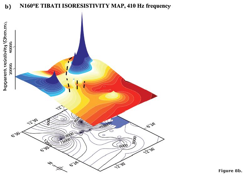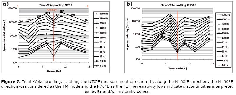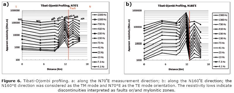 The 20 km length TibatiTignere profile (Figure 5) shows a major discontinuity, situated at approximately 6 km from the first station, B05. For all frequencies, and in the two measurement directions, one can see the abrupt decrease of apparent resistivities in B02a. The presence of almost horizontal layers is easily inferred along this profile, in the two directions, especially in the N70°E. These horizons are interrupted by the above mentioned discontinuity and are more clearly seen in the N70°E direction where quasisymmetry of the edges of the apparent resistivitiy breaks can be observed.