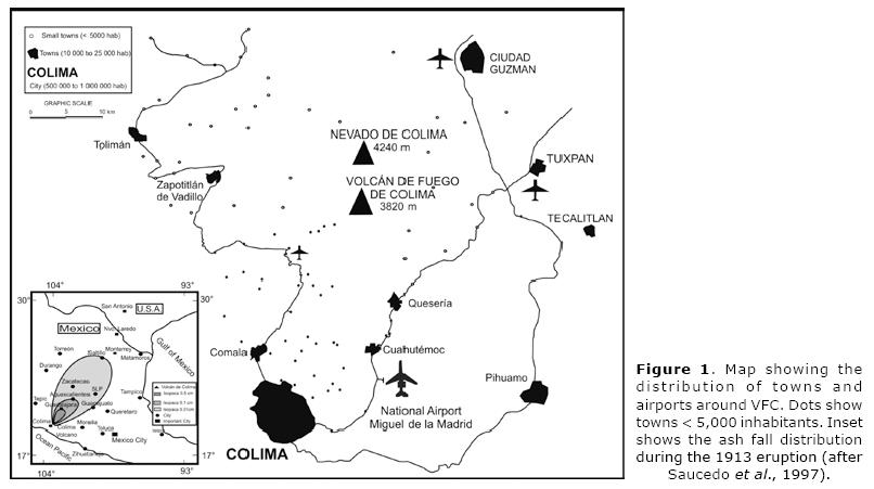 Volcán de Fuego de Colima (VFC; 19°30'45" N, 103°37' W, 3860 m asi) is the most active volcano in Mexico (MedinaMartínez, 1983; Luhr and Carmichael, 1990; De la CruzReyna, 1993; Bretón et al., 2002). Several small and mediumsize towns and cities of Colima and Jalisco states lie in the surroundings, and have their main airports around the volcano (Figure 1). Approximately 390,000 people live within 40 km of the volcano (Bretón et al., 2002). The closest and most important urban concentration (Colima City) is located 32 km SSW from the vent. During past eruptions of VFC, other important cities like Guadalajara (located approximately 150 km N, see inset of Figure 1) have been affected by ash fallout (Saucedo et al., 2010). The airport of Colima City is located approximately 30 km S from the vent and some small local airports near the zone might be affected in case of ash fall events. Furthermore, volcanic products injected into the atmosphere can be transported by the wind several thousands of kilometers away affecting commercial airways (see, Aeronautical Chart edited by JEPPESEN, LA (H/L) 1). With the increase of aeronautical operations, the hazard to civil aviation is always present. Reports of several accidents, without casualties but with several millions of dollars spent in reparation and maintenance do exist (e.g., Casadevall, 1994).