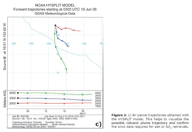 Comparing the HYSPLIT and MODIS brightness temperature difference, it is possible to predict the ash and SO2 clouds dispersion (Figure 2b and 2c).