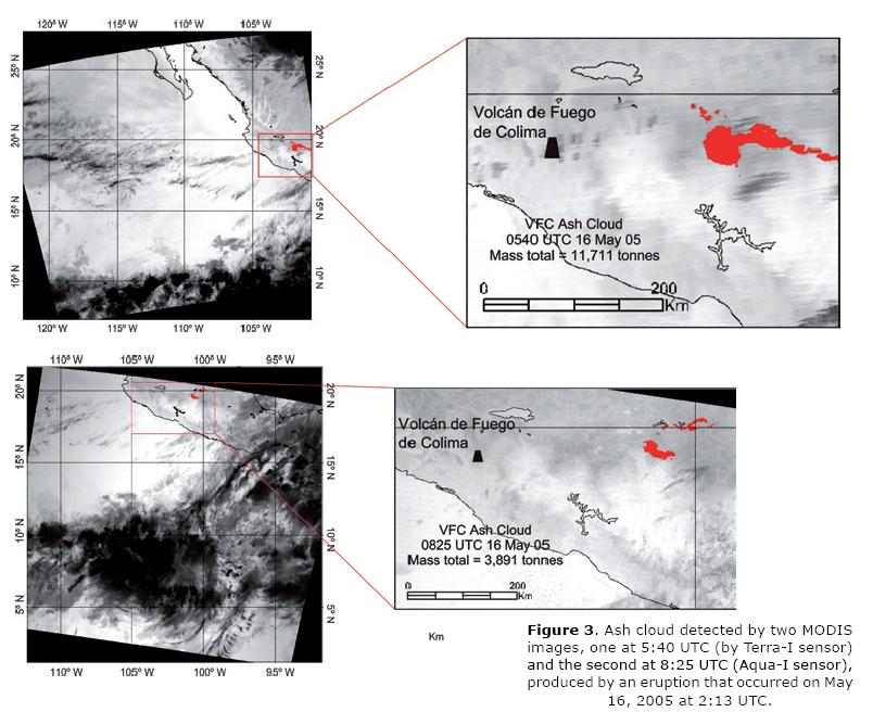b) Analysis of ash cloud residence in the atmosphere. This case consists of tracking ash clouds in order to analyze time residence in the atmosphere. The volcanic cloud of an eruption reported on May 16 at 2:13 UTC was detected by two MODIS images (Figure 3), first of them at 5:40 UTC (image from MODISTerra), and the second ¡mage was taken at 8:25 UTC (MODISAqua). The ash mass calculated for the first one was ~11,700 tons, covering an area of ~3,200 km2, and found at ~80 km east of the volcano (between 19° 44'to 19° 19' N and 102° 6'to 100° 39' W). The Washington VAAC reported a cloudaltitude of approximately 7,600 m asl, displacing at 15 m/s. The second image shows the ash cloud 95 km further east from the observed position of the volcanic cloud in the previous image but with an ash massload of ~4,000 tons covering an area of ~1,600 km2. In 2 hours and 45 minutes, the ash cloud lost 67% of its mass and 50% of its area, indicating an ash fall of ~5 g/m2. This rate is similar to the ash fall reported for Sakurajima volcano (Japan) at >50 km from the vent (Eto, 2001) and same orderofmagnitude as the ash fall estimated for violent Strombolian to Plinian eruptions at Vesuvius (Italy) (Macedonio et al., 2008). The ash fall rate of ~8' 105 g/s is less than in the case of Sakurajima volcano (~21' 105 gr/s). The ash accumulation rate was calculated in ~5' 105 gr/m2•s.