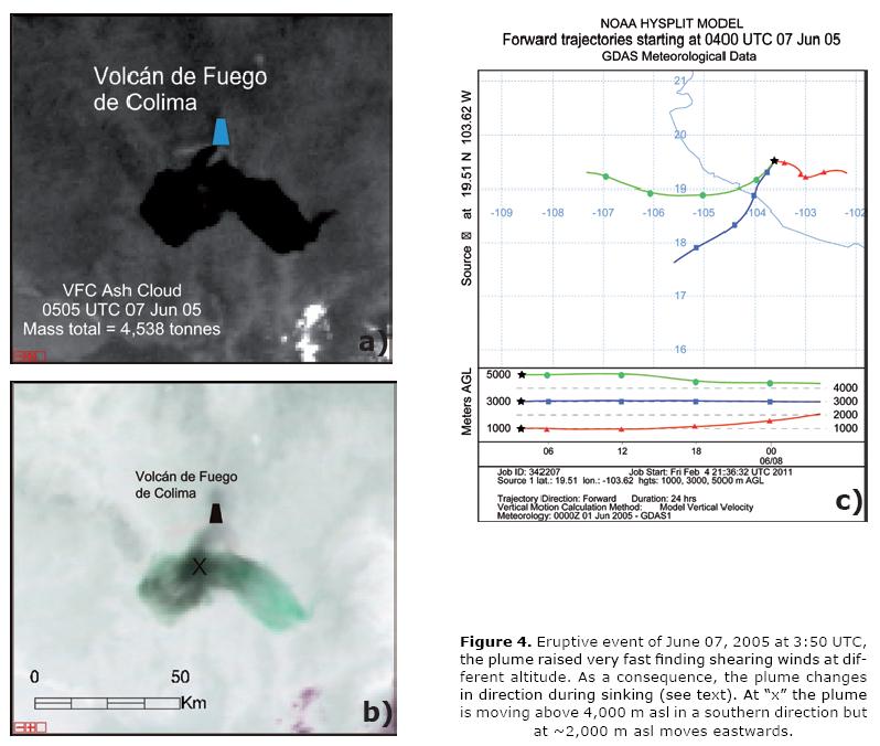 c) Effects of shearing winds on volcanic clouds. In this case a volcanic plume raises or sinks vertically very fast finding shearing winds during the ascent at different altitudes. This effect makes the cloud to "screw" and vertically moving in the same area but at different heights. This effect should be taken into account while analyzing MODIS images because the plume becomes apparently thicker whereas actually, the plume is passing over the same area twice at different altitudes and moving directions but being only one plume. It is important to note that optically, the plume will be thicker, as there is more ash in the optical path between the sensor and the ground. An example of this case was observed during the event of June 7. An explosive event began at 3:50 UTC and was detected by the MODIS satellite at 5:05 UTC as shown in Figure 4. In this case the shearing winds changed the plume direction (Figure 4c). As plume forms and leaves the vent, it raises quickly and is taken by high altitude winds (<5,000 masl) towards the south, as the ash plume gets colder and gets away from the vent, it sinks and is caught by lower winds (<4,000 masl) "screwing" down to be driven by winds at nearly 2,000 masl (VFC is 3,860 m high) towards the east. This effect should be taken into account for proper calculation of ash or SO2 burden.