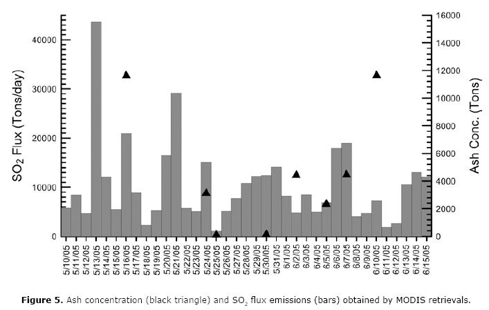 Each ash emission can be linked with a peak in SO2 emission (about 2 or 3 days before the explosive event) as shown in Figure 5. For instance, the SO2 fluxes reported using the MODIS method for May 10 and May 11 were 5,500 and 8,000 tons/day, respectively. However, on May 13, 3 days before the large explosion and ash emission, a large scale degassing occurred with an SO2 flux of 40,000 tons/day and a plume covering an area of 126 km2 (plume was dispersed towards the north at 9 m/s, and at an estimated altitude of 6 km). After the event, the gas emissions fell to very low values. This was possibly due to partial sealing of the conduit system, and/or changes in magma viscosity after a strong degassing restricting gas emissions but increasing the pore pressure of the magma. A change in viscosity may have caused gas accumulations with a subsequent internal pressure build up (Newhall et al., 1994). Three days later (16 May 2005), the system was opened with an emission of ash and a SO2 plume. The SO2 mass was estimated in 575 tons, covering an area of 308 km2, and the emission rate was calculated in 21,000 tons/day. Before a large ash emission, a large SO2 emission occurs, an effect observable during the ash emissions of May 24, June 02, 05 and 10.