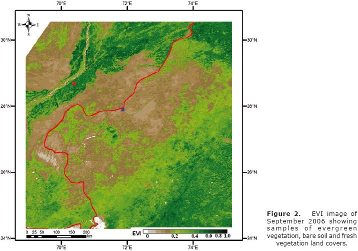 Figure 5 clearly shows the high EVI values for 2006 showing an exuberant vegetation coverage in the midst of the Rajputana Desert which is very unusual. In 2001 EVI image shows some vegetation coverage in the border of the Rajputana Desert and agrees with the precipitation graph (Figure 4) that shows greater precipitation in this year and 2003 (not available). In the 2002 and 2004 EVI image no vegetation was seen while in the 2000 and 2005 EVI image only traces of vegetation were seen in this study region. Whether a similar growth of vegetation occurs in the recent years is an interesting question. Indeed, in August and September 2010 exuberant vegetation can be seen in Figure 5 as indicated by high values of EVI. This is clearly due to the high precipitation in the monsoon season of 2010. In an earlier study (Pant and Hingane, 1988) an increasing trend of 141.3 mm of rainfall per 100 years was observed over Northwest India including West Rajasthan during the summer monsoon season. The trend over West Rajasthan is significant at 99% level by 't' test. A similar increasing trend of rainfall was also observed for Northwest India in another study (Rupa Kumar et al., 1992). This information put together with the recently found increase of heavy rainfall events (Goswami et al., 2006) suggests that in a continued warming environment the increase of vegetation over West Rajasthan is highly probable.