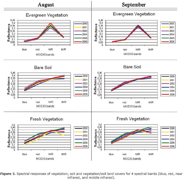 Figure 3 shows the spectral responses for August and September of 2000 to 2006 (except 2003), for the corresponding land cover samples as marked in Figure 2. In Figure 3, it can be seen that evergreen vegetation and bare soil classes presented consistent spectral responses for all years, while fresh vegetation class presented spectral response like soil in 2004 and 2005 years and spectral response like vegetation in 2006. It means that vegetation has been generated during 2006 due to the increase of precipitation in the study area.