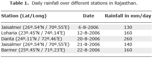 In the 2006 monsoon season (June to September), the Rajasthan desert region experienced unprecedented heavy rainfall events which led to severe floods and intense human suffering. Unconfirmed sources mentioned that 138 people lost their lives and the property damage up to the end of August was about 366 million dollars.