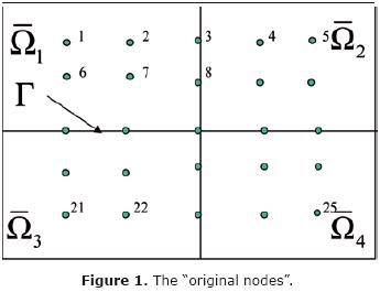 In previous papers [Herrera and Yates 2010; Herrera and Yates 2009] a general framework for domain decomposition methods, here called the 'derived vector space framework (DVSframework)', has been developed. Its formulation starts with the system of linear equations that is obtained after the partial differential equation, or system of such equations, has been discretized. We shall call, this system of linear equations, the 'original problem'. Independently of the discretization method used, it is assumed that a set of nodes and a domainpartition have been defined and that both the nodes and the partitionsubdomains have been numbered. Generally, some nodes belong to more than one partitionsubdomain (Figure 1). For the formulation of nonoverlapping domain decomposition methods, this is an inconvenient feature. To overcome this problem, the DVS framework introduces a new set of nodes, the 'derived nodes'; a derived node is a pair of natural numbers: a nodeindex followed by a subdomainindex, which may be any that fulfills the condition that the node involved belongs to the corresponding partitionsubdomain. As for the nodeindices, they are referred to as the 'originalnodes'.