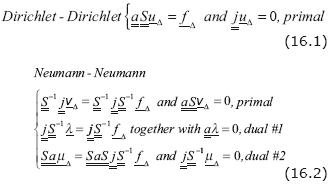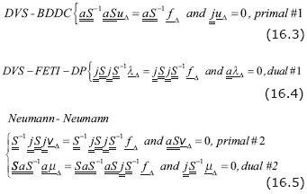 6. The most commonly used methods, BDDC and FETIDP, have been incorporated in this framework, producing in this manner DVSversions of such methods. Eq. (16.1), is the primal formulation of a DirichletDirichlet problem; when this is preconditioned the DVSBDDC is obtained. The formulation of a NeumannNeumann problem using the counterpart of the SteklovPoincaré operator, given in Appendix "B", yields a dual formulation, which is stated in the second equality of Eq. (16.2). The DVS version of FETIDP, of Eq. (16.4), is the preconditioned form of this formulation;