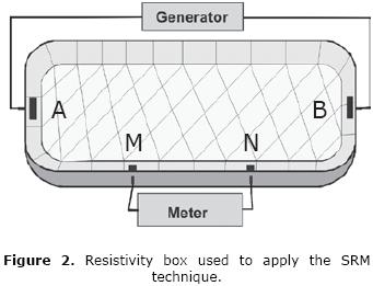 Potential electrodes M and N are connected to the meter, and electrodes A and B are connected to the generator. The current (I) is injected to the resistivity box through electrodes A and B (Figure 2). The meter shows a value corresponding to the potential difference (AU) between electrodes M and N.