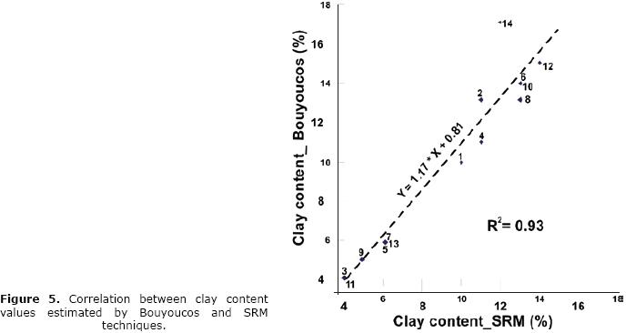 The graph in Figure 5 shows the good correspondence between clay content quantity estimated by both techniques (Bouyoucos and SRM) based on linear regression analysis. The linear equation is close to the identity function (Y = X), with a low dispersion (coefficient of determination, R2, equal to 0.93).