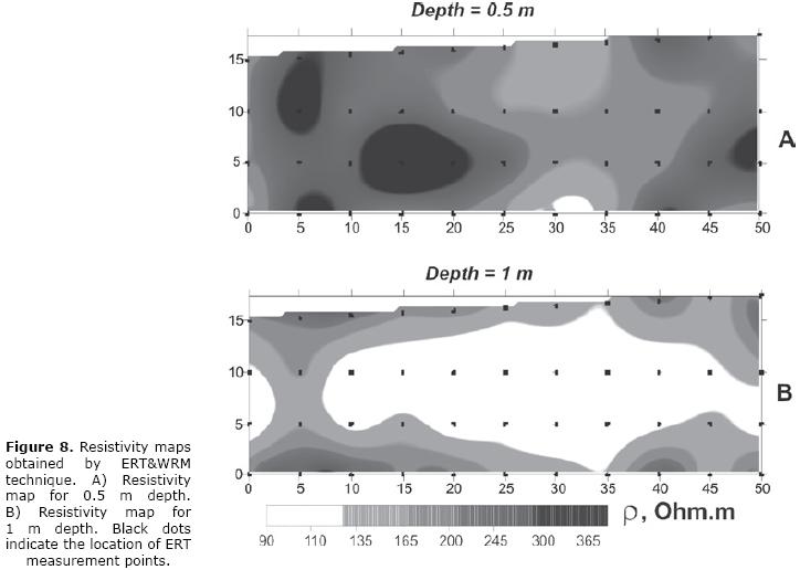 Taking into account the resistivity behavior in sections of the Figure 3, two maps were drawn for depths 0.5 m and 1 m (Figure 8), showing that at depth 0.5 m (Figure 8A) there are values of resistivity higher than at 1 m of depth (Figure 8B).