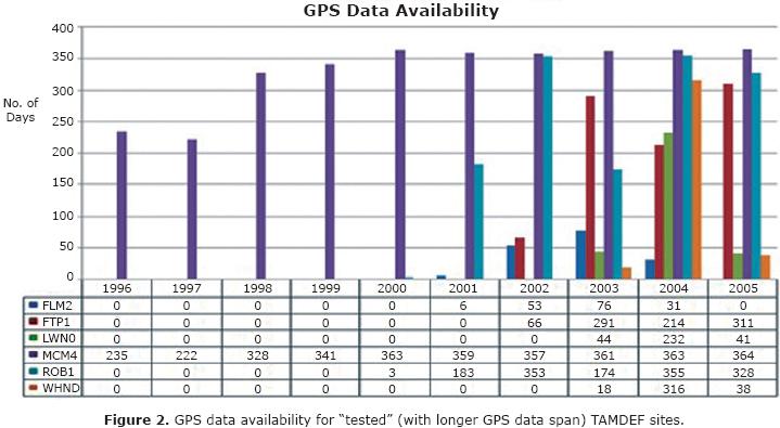 When TAMDEF network was first established, only GPS data for a short of time period (1 or 2 weeks) was available. However, this has improved over the past few years and data from some permanent quasi-continuous (with 1 to 3 months of data) and also continuous trackers (with almost the entire year of data) are now accessible for further processing. Figure 2 illustrates TAMDEF station data availability for those sites (FLM2: Mount Fleming 2; FTP1: Fishtail Point 1; LWN0: Lonewolf Nunatak; MCM4: McMurdo; ROB1: Cape Roberts; WHN0: Westhaven Nunatak) with longer GPS data span from 1996 to 2005, hereinafter called "tested" sites.